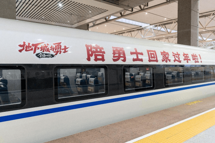 由DNF冠名的游戏主题定制高铁专列,现已启程“护航各位勇士回家过年”。从车身外涂装到车厢内饰、座位枕巾,进行全方位的沉浸式IP包装。将单一的交通载具升级为融合数字文化的“移动文旅空间”,为传统出行赋予全新的文化内涵与情感连接。