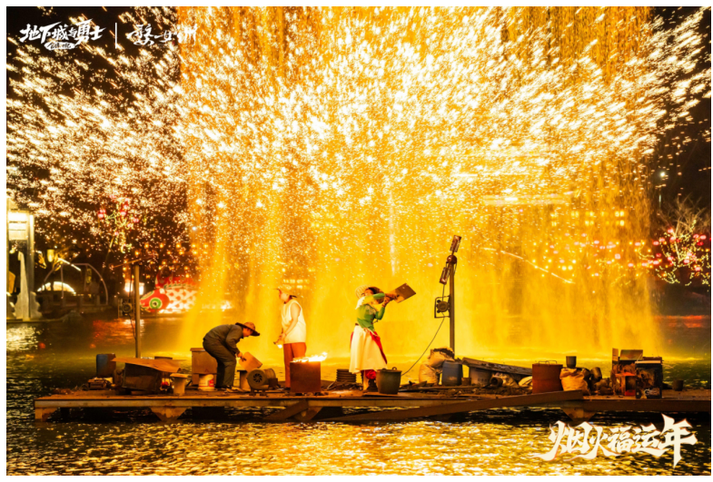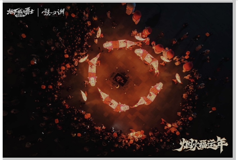 随着鱼灯巡游的脚步,人们在张灯结彩的街巷中漫步,魔界雪人化身萌趣使者,围绕在鱼灯周围,用俏皮姿态点亮新春夜游氛围。步至五显湖、抱玉塔,非遗表演老师们身着“林纳斯”、“赛丽亚”与“剑魂”经典服饰,用传统非遗打铁花和火壶表演,配合烟花秀,点燃火树银花,气氛达到高潮。从湖畔移步鱼纹广场中心,古老的非遗技艺傩舞同步上演,表演者以刚劲舞步驱邪迎好运,引得现场观众阵阵喝彩,祈福声与欢呼声交织成最鲜活的新年乐章。